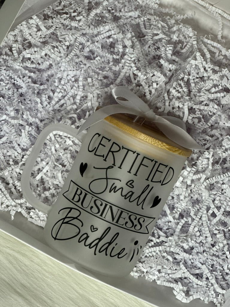 Get your caffeine fix in style with our "Certified Small Business Baddie" glass mug. Perfect for sipping on your morning coffee while owning your boss babe status. Made for confident, quirky baddies just like you. Start your day with a dose of confidence and caffeine. Get yours today!
